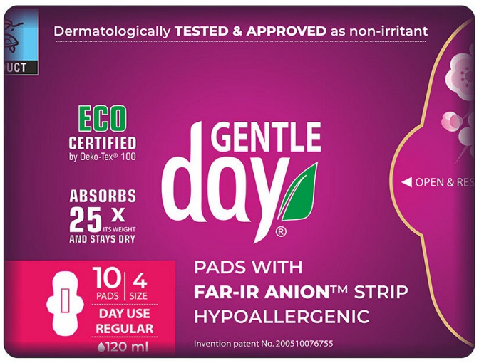 Tillverkad av 100 % ekologiskt certifierade material ger GENTLE DAY®-bindor ett naturligt skydd som är skonsamt mot både huden och miljön. Den innovativa FAR-IR Anion-remsan kan bidra till att minska obehag under menstruationen. Dessa bindor absorberar upp till 10 gånger mer än vanliga bindor på marknaden, vilket ger ett säkert skydd hela dagen utan oro för läckage.