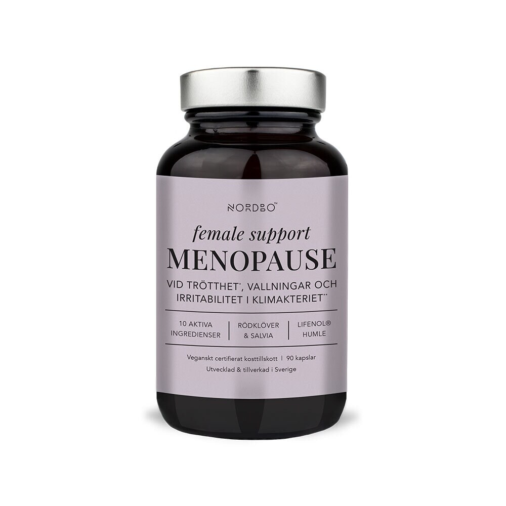 NORDBO Female Support Menopause är veganskt certifierad av Djurens Rätt och fri från gluten, socker, soja och laktos. Produkten är utvecklad och tillverkad i Sverige med fokus på kvalitet, hållbarhet och dokumenterad effekt. Förpackningen är gjord av glas och metall som kan återvinnas oändligt och ger ett fullständigt skydd mot fukt och luft.