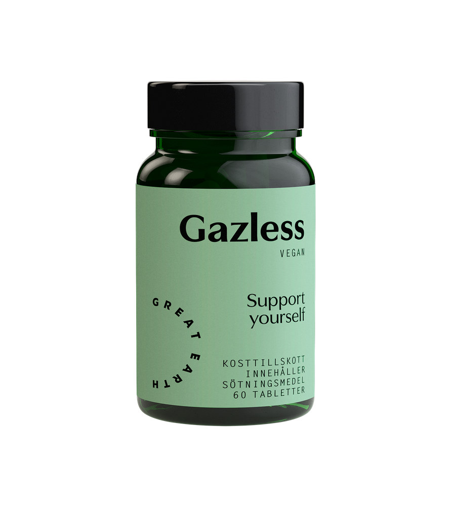 Gazless är en enzymprodukt som intas vid måltider för att undvika uppblåst och gasig mage.