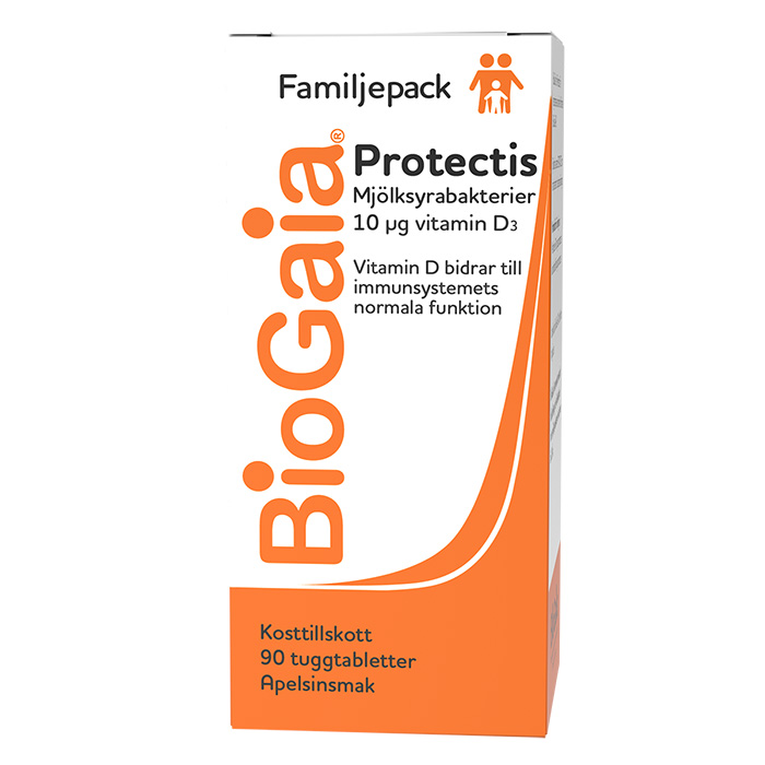 En tuggtablett som innehåller mjölksyrabakterien Lactobacillus reuteri Protectis (bakterie av humant ursprung) i en unik kombination med rekommenderad daglig dos av 10 mikrogram D3 vitamin. Passar alla åldrar. För mage och immunförsvar.