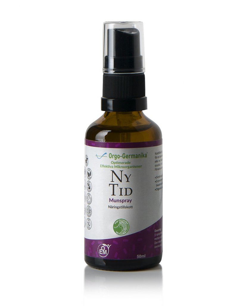 Med 34 stammar av mikroorganismer koloniserar Ny Tid munspray munslemhinnan och tungan och hjälper dig att skapa och upprätthålla en hälsosam bakteriebalans. Bakterierna i Ny Tid munspray är noga utvalda, kommuniserade, samordnade, GMO-fria levande stammar (MicroVeda® Effektiva Mikroorganismer). Som en speciellt fermenterad, icke-steriliserad munspray erbjuder Ny Tid inte bara en mängd livsfrämjande bakterier utan också andra viktiga enzymer, bioaktiva växtämnen, antioxidanter och vitaminer som vardagliga kosttillskott.
