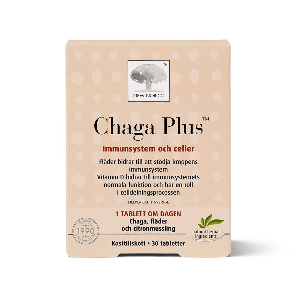 Chaga Plus™ är ett svenskt kosttillskott utvecklat med fokus på immunsystemet. Produkten är baserad på svampen chaga, citronmussling och extrakt av fläder och långpeppar, tillsammans med vitaminer och mineraler. Vitamin D bidrar till immunsystemets normala funktion. Fläder bidrar till att stödja kroppens immunsystem.