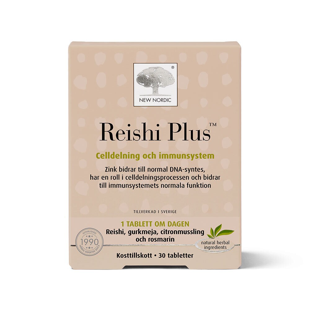 Reishi Plus är ett svenskt kosttillskott utvecklat med fokus på immunsystemet. Produkten är baserad på svampen reishi, extrakt av gurkmeja och rosmarin tillsammans med vitaminer och mineraler. Zink bidrar till immunsystemets normala funktion.