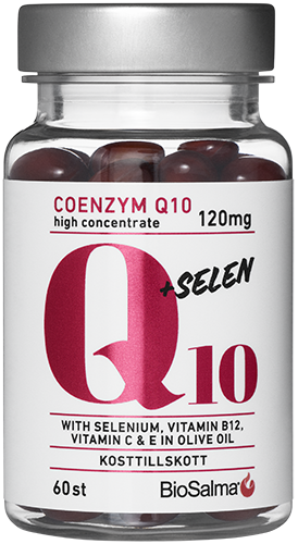 BioSalma® Q10 + selen är ett kosttillskott som bland annat innehåller ämnen för att skydda kroppens celler mot oxidativ stress såsom C, E-vitamin samt selen. Produkten innehåller också Coenzymet ubikinon även känt som Q10 samt vitamin B12 som bidrar till minskad trötthet och utmattning.