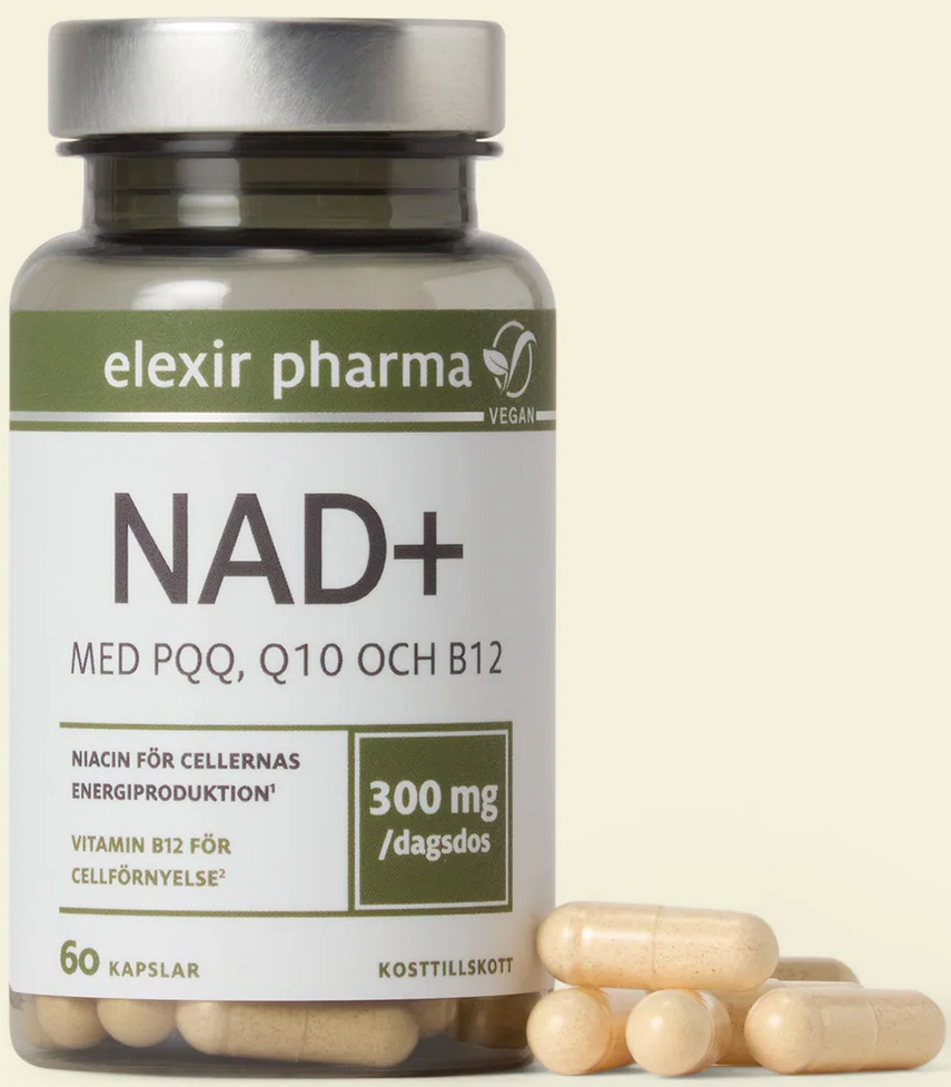 Elexir NAD+ består av nikotinamidribosid (NR) som är en form av niacin, dvs vitamin B3. NR bidrar till att öka nivåerna av NAD+ i kroppen. En exklusiv formula kompletterad med pyrrolokinolinkinon (PQQ), Q10 samt vitamin B12.