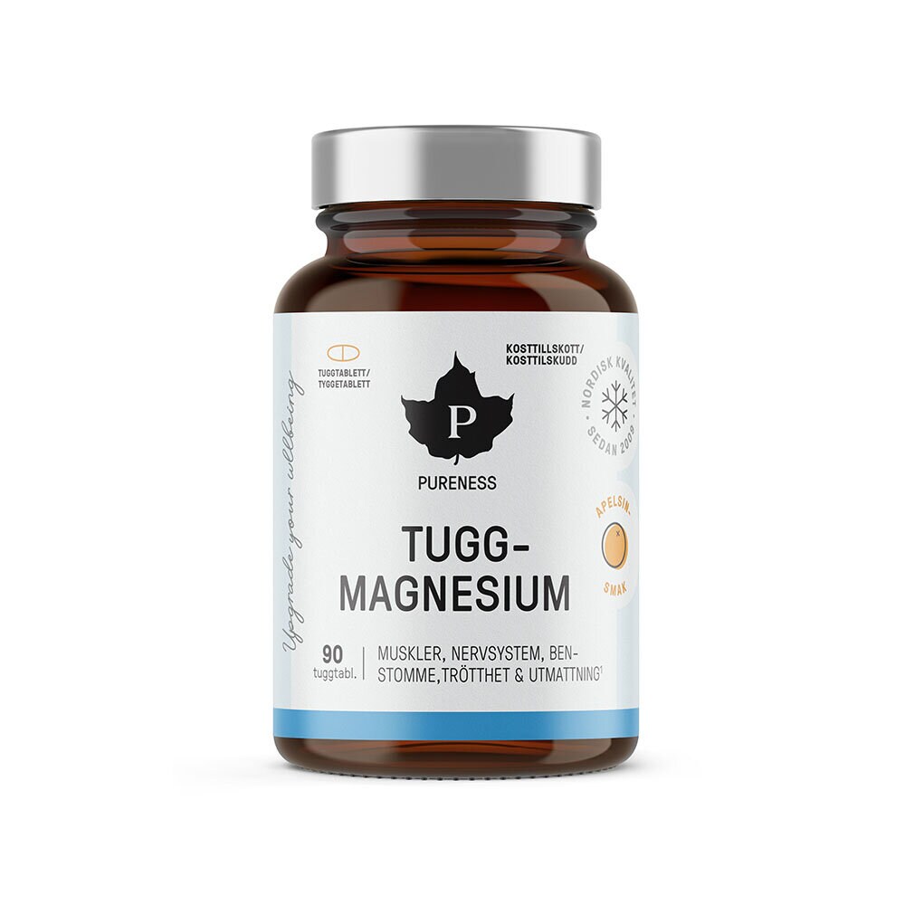 Pureness Tuggmagnesium är en välsmakande tuggtablett med magnesium. Magnesiumformen i tabletten är magnesiummalat, vilket är en högkvalitiv kvalitet och magvänlig form av magnesium.