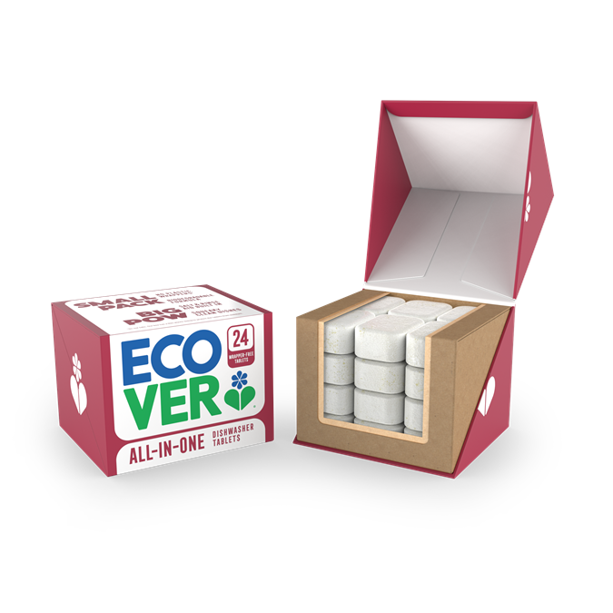 Den lilla, kompakta förpackningen innebär att förpackningen bara innehåller disktabletter – ingen luft.