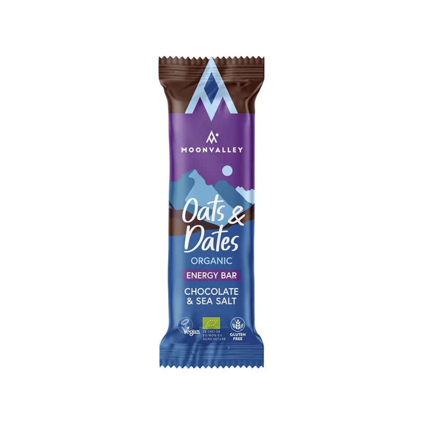 Moonvalley Oats & Dates Bar Chocolate & Sea är en naturlig bar med smak av choklad och havssalt. Gjord på ekologiska ingredienser som dadlar, havre och kakaopulver. Helt fri från tillsatser, sötningsmedel och raffinerat socker.