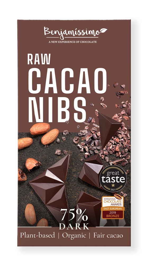 Benjamissimos ekologiska och veganska 75 % mörka choklad med kakaonibs – en kraftfull kombination av högkvalitativ choklad och knapriga råa kakaonibs, som lyfter fram kakaons naturliga smak och textur.