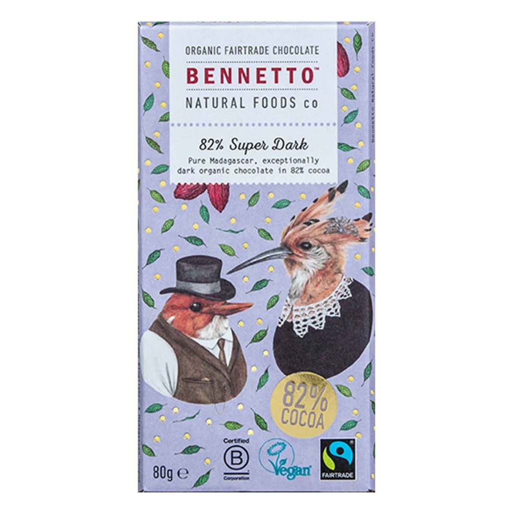 Genom att du köper denna mörkachoklad stödjer du en av de mest biologiskt mångfaldsrika platserna på jorden; Den tillverkas nämligen av ekologiska och Fairtrade-certifierade kakaobönor från Masoalahalvön i Madagaskar; Denna plats är hem för många unika fågelarter och andra djur som inte finns någon annanstans. Genom att välja 82% Super Dark, bidrar du till MaMaBay Conservation Through Cocoa Project, ett initiativ som syftar till att återställa avskogad mark till frodig tropisk regnskog genom att plantera kakaoträd tillsammans med vanilj, kryddnejlikor och inhemska lövträd.