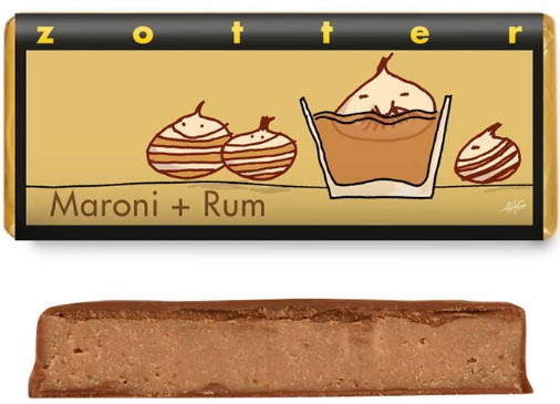 A fine chestnut puree, tender-melting almond praline, honey, Amaretto and a generous dash of rum combine to make a seductive filling, covered with a combination of homemade sweet chestnut couverture and milk chocolate with 50% cocoa power.