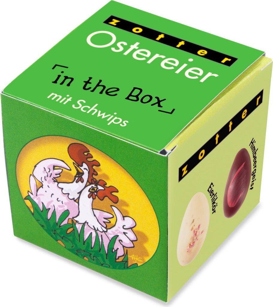 Zotter Organic Boozy Easter Eggs in a Box. A small gift box with 4 Easter eggs, seductively filled with creamy and boozy eggnog and fruit brandy fillings, beautifully decorated by hand and featuring colourful patterns created with berries and other fruit.