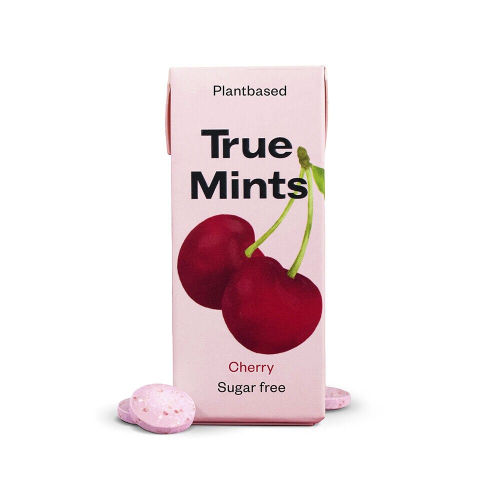 True Mints Cherry är fruktiga pastiller med frisk smak av körsbär. De är sockerfria, veganska och gjorda på växtbaserade ingredienser. Sötade med xylitol som ger en fräsch känsla i munnen och med naturlig arom som ger en autentisk körsbärssmak.