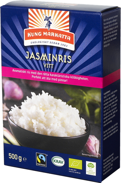 Kung Markattas ekologiska Jasminris vitt kommer från ekologiska odlingar i Thailand. Det är ett aromatiskt och klibbigt ris som är enkelt att äta med pinnar. Att det är Fairtrademärkt bidrar till att det smakar riktigt gott.