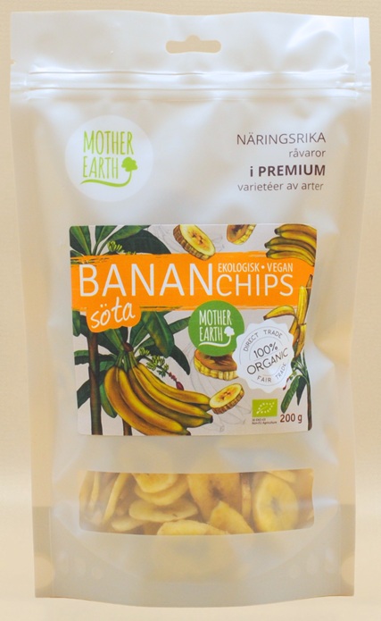 Ingredienser: bananer (ca 60%), kokosnötolja (ca 26%), rörsocker (ca 14% Ursprung: Filipinerna Förvaring: Förvaras torrt och svalt. Näringsvärde per 100 g: Energivärde: 2135kJ/510 kcal Fett: 26 g - varav mättat fett: 23 g Kolhydrater: 66 g - varav sockerarter: 23 g Fibrer: 5 g Protein: 2 g Salt: 1 mg