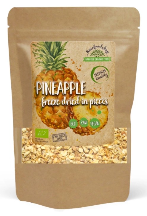Den krispiga och smakrika frystorkade ananasen är otroligt mångsidig. Ät den direkt ur påsen för ett snabbt och enkelt mellanmål, eller lägg till den i din morgonmüsli eller granola för en härlig tropisk smakupplevelse. Vill du skapa en “raw” ananas-efterrätt till eftermiddagsfikat? Blanda bitarna med andra torkade frukter och nötter för att skapa rawfood-bollar eller toppa en “raw” cheesecake med ananasbitar för en extra fräsch smak.