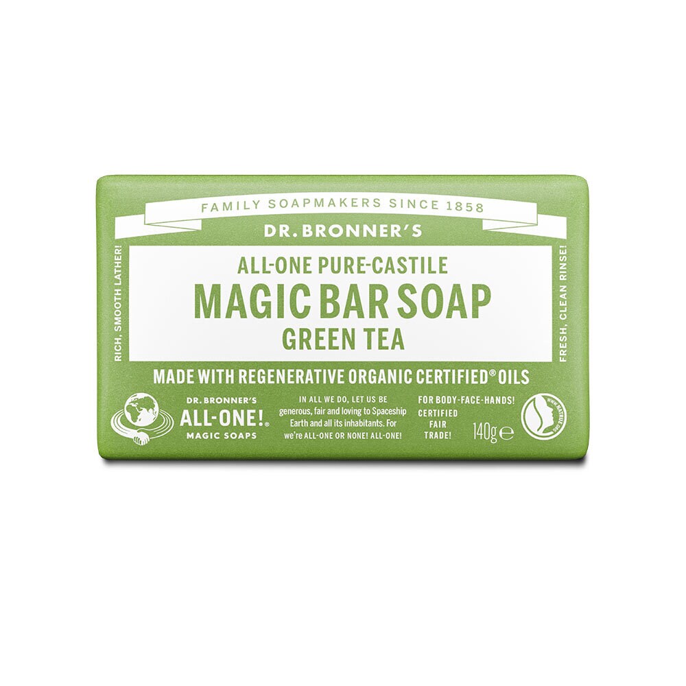 Dr. Bronner’s Pure-Castile Bar Soap Green Tea är en ekologisk & vegansk fast tvål med frisk doft av melon, gräs & enbär. Mild, effektiv & skonsam formulering som rengör utan att torka ut. Passar händer, kropp, ansikte & hår.