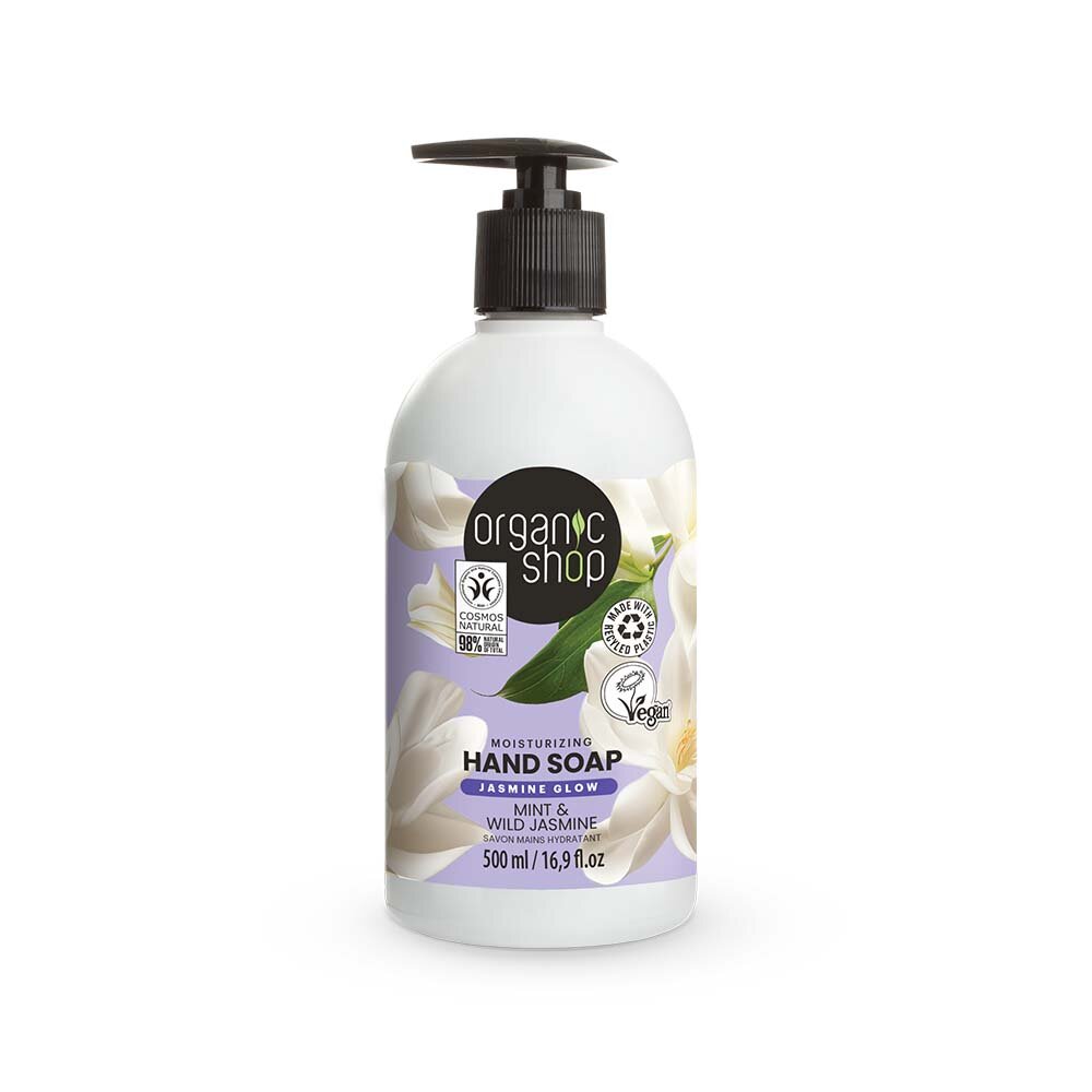 Organic Shops Handtvål Jasmin & Mint är en fuktgivande handtvål med ekologisk mynta- och jasminextrakt, tvålen ger näring och mjukgör händerna.
