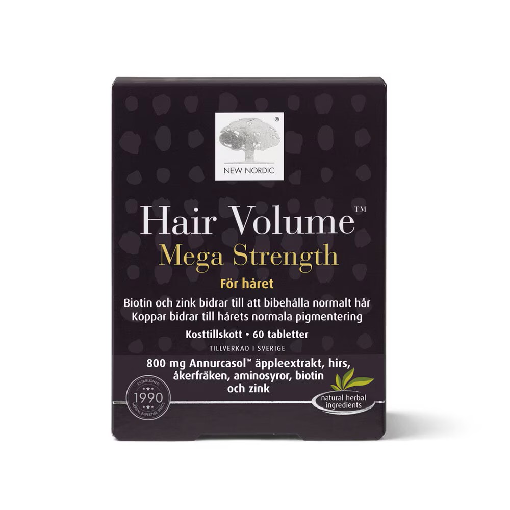Hair Volume Mega Strength är ett kosttillskott för håret med extra högt innehåll av äppleextrakt. Innehåller biotin och zink som bidrar till att bibehålla normalt hår. Smidig tablettform för daglig användning.