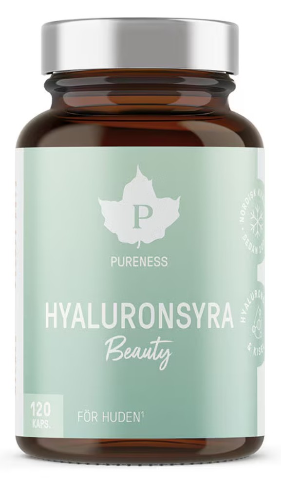 Pureness Hyaluronsyra 120 kapslar är ett tillskott för dig som vill vårda huden inifrån. Varje kapsel innehåller 200 mg hyaluronsyra, vitamin C och åkerfräkenextrakt, som är en naturlig källa till kisel. Vitamin C bidrar till normal kollagenbildning och hjälper till att skydda cellerna mot oxidativ stress.