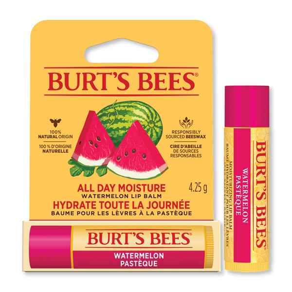 Burt's Bees Watermelon Lip Balm är ett helt naturligt läppbalsam med näringsrika ingredienser som bivax, sheasmör och E-vitamin. Skyddar, mjukgör och vårdar torra, spruckna läppar. Läppbalsamet doftar fruktigt och fräscht av vattenmelon. Det praktiska stiftet går att återanvända. Det naturliga läppbalsamet känns mjukt utan att vara klibbigt, och kommer snabbt kännas oersättligt i handväskan!